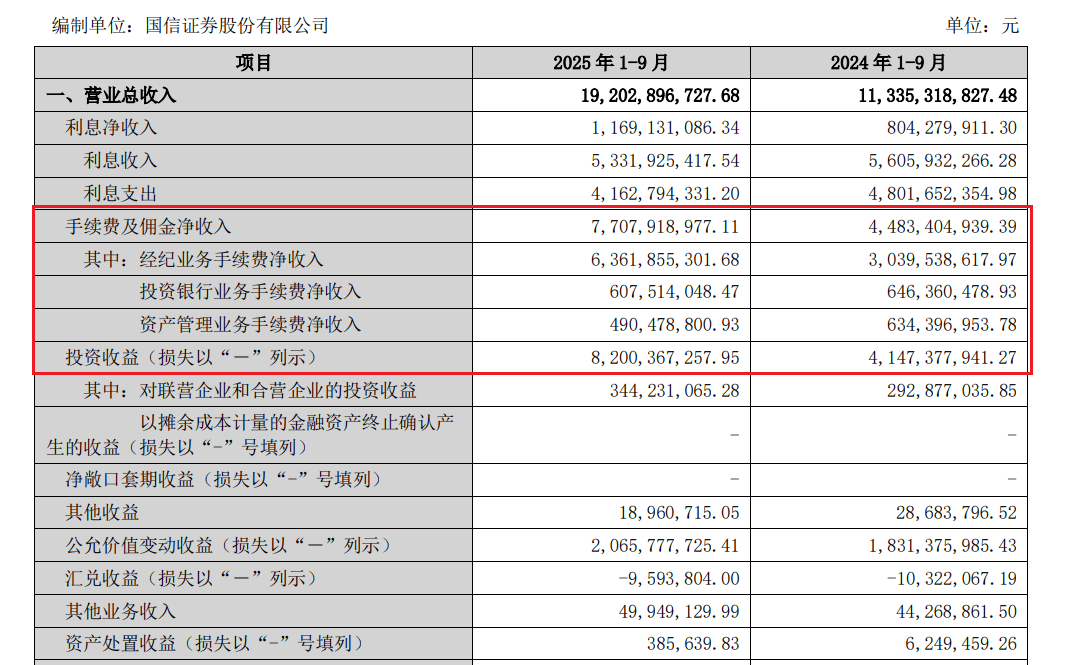 2025年前三季度,国信证券投资收益达82亿元,同比大增97.73%,主要源于金融工具投资收益的大幅增加。