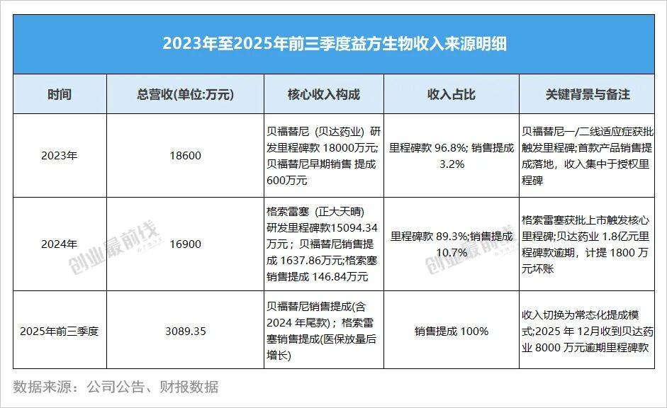 根据合作协议,益方生物有权获得贝达药业总计2.3亿元的首付款和研发里程碑付款,以及10%-15%的销售提成。