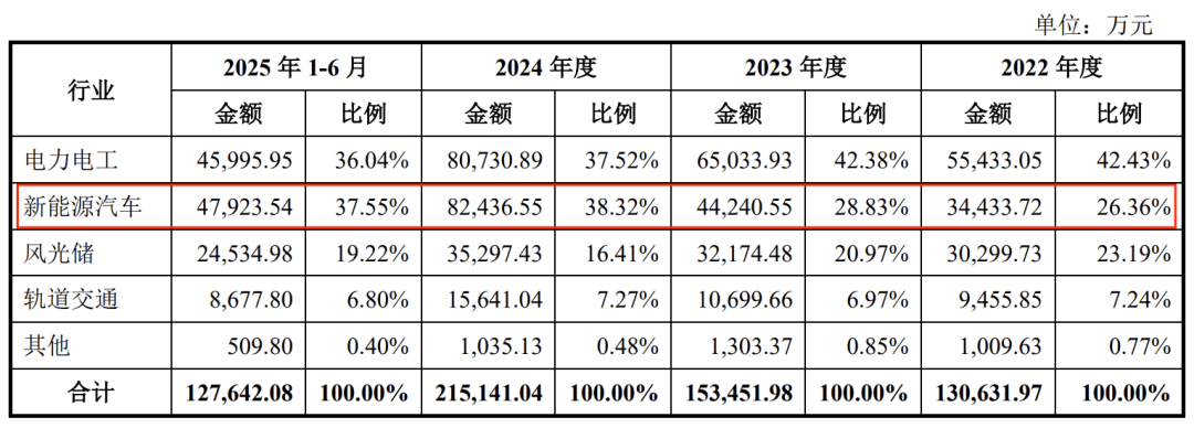 从2024年开始,新能源汽车行业的营收规模超过了电力电工,成为贡献营收最多的行业。